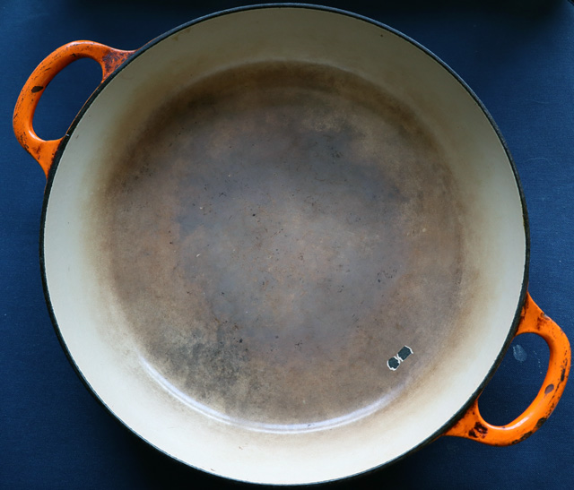So I sent of the photos to customer care at Le Creuset saying that, after at least 20 years wear, I wasn’t complaining, more asking if it was repairable or safe to continue using.