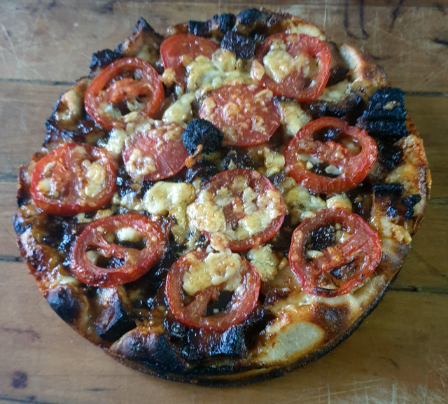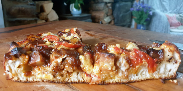 I knocked up some of the 80% hydration pizza dough yesterday. Haven’t done a deep-pan pizza for some time so 340g of dough in an 8 inch ring on a pizza tin. Layer of small cubes of cheddar, proved for about three hours. Studded the dough with cubes of pork, layer of barbeque sauce, layer of sliced tomatoes, layer of cheddar.
