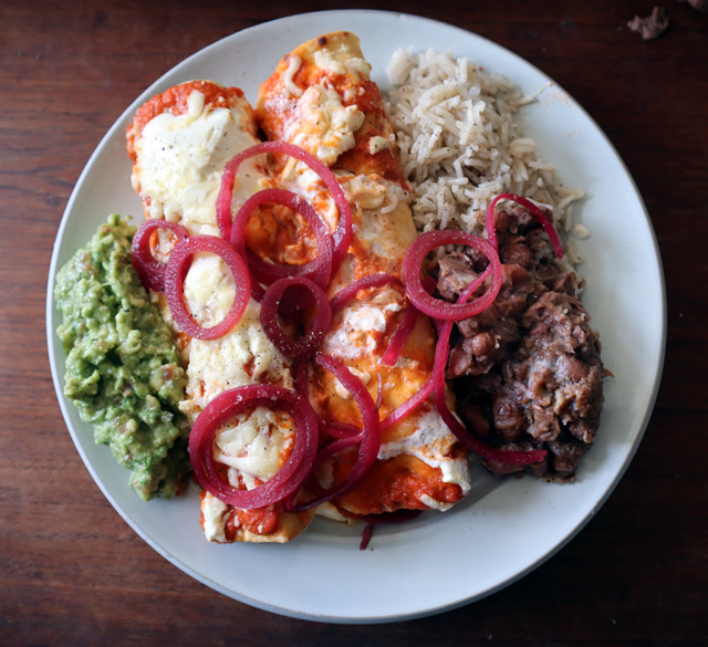 Sunday lunch. Pork Enchiladas, Guacamole, Rice, Frijoles Refritos, Quick Pickled Onions.