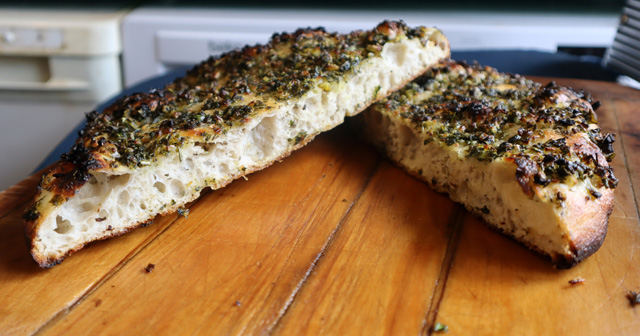 So this simple focaccia used my 80% hydration dough with a mixture of dried herbs in the dough, and before baking was coated in a mix of fresh herbs (parsley, rosemary, basil, mint, thyme, sage, dill) in olive oil and a little finely chopped shallot + a sprinkling of salt.
