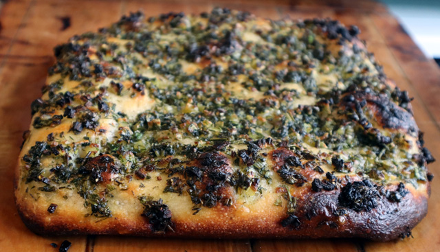 So this simple focaccia used my 80% hydration dough with a mixture of dried herbs in the dough, and before baking was coated in a mix of fresh herbs (parsley, rosemary, basil, mint, thyme, sage, dill) in olive oil and a little finely chopped shallot + a sprinkling of salt.