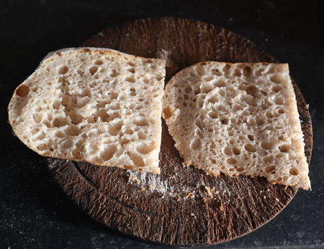 After proving, each dough has to be gently stretched and pressed out to 14″ by 5″ so you need a system for achieving this and getting it onto its final resting place, a baking sheet. I did it by part-shaping on a floured work surface, quickly lifting it onto the floured baking sheet with the aid of a scraper, and completing the shaping in situ. Might be easier to use wide strips of baking parchment.