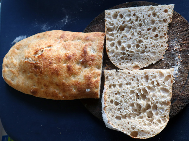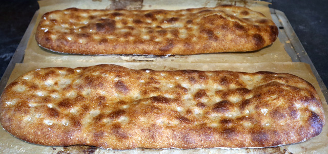 After proving, each dough has to be gently stretched and pressed out to 14″ by 5″ so you need a system for achieving this and getting it onto its final resting place, a baking sheet. I did it by part-shaping on a floured work surface, quickly lifting it onto the floured baking sheet with the aid of a scraper, and completing the shaping in situ. Might be easier to use wide strips of baking parchment.