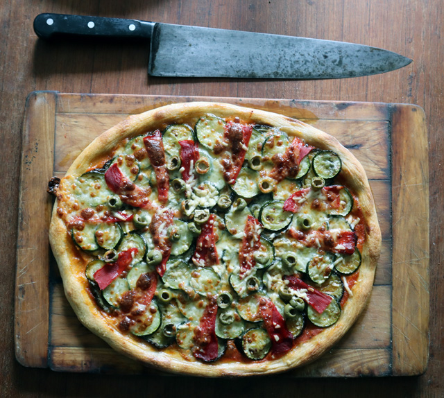 I mean there’s nothing particularly special about it: 400g of my basic pizza dough fermented for 24 hours, very basic tomato sauce, layer of softened aubergine, layer of softened courgettes, piquilo chiles, scattering of green olives, mozzerella. It’s a big boy, 14½” long (that’s a 12″ carbon steel Sabatier in the picture. Got it for a tenner in a sale).