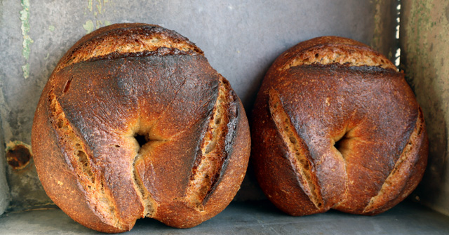 Next morning: my usual hand mix: 3×10 kneads at 5 minute intervals, 4 hours fermentation with hourly folds. Divide the dough, roll the pieces, join the ends to form a circle, prove for 3½ hours. Slashed and baked for 45 minutes in the Pico, 250C top-220C bottom, steam for first 15 minutes.