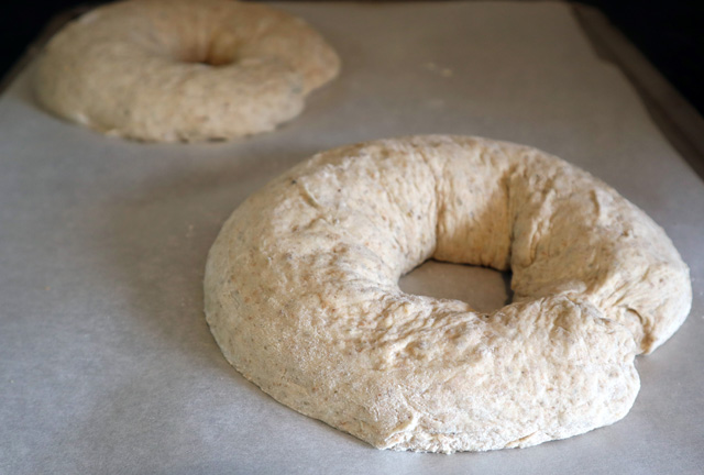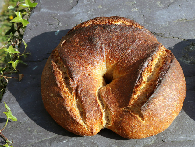 Next morning: my usual hand mix: 3×10 kneads at 5 minute intervals, 4 hours fermentation with hourly folds. Divide the dough, roll the pieces, join the ends to form a circle, prove for 3½ hours. Slashed and baked for 45 minutes in the Pico, 250C top-220C bottom, steam for first 15 minutes.