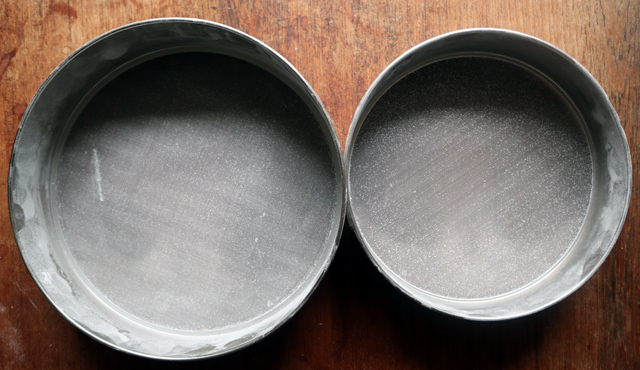 Ignore the diameters, that’s just a red herring. The sieve on the left is 60 mesh, the one on the right is 80 – we now know that 60 mesh has bigger holes than the 80.