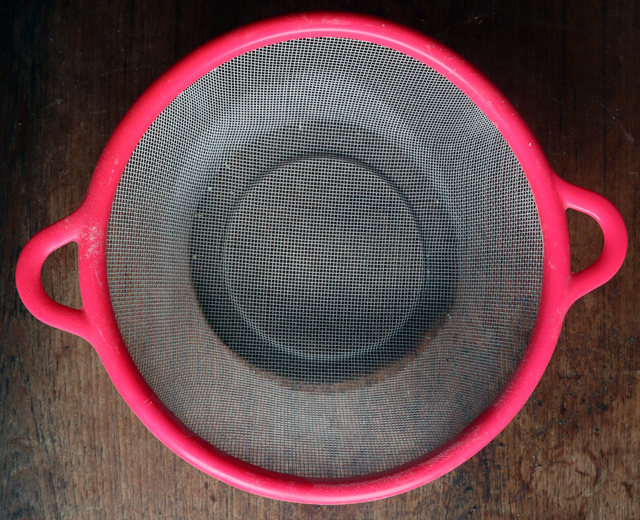 So this is my £1.00, off the market, low status sieve I usually use for straining the seeds out of my tabasco-style chile sauce. It doesn’t count as baking gear – why you can even see the mesh without magnification – but it has its uses.