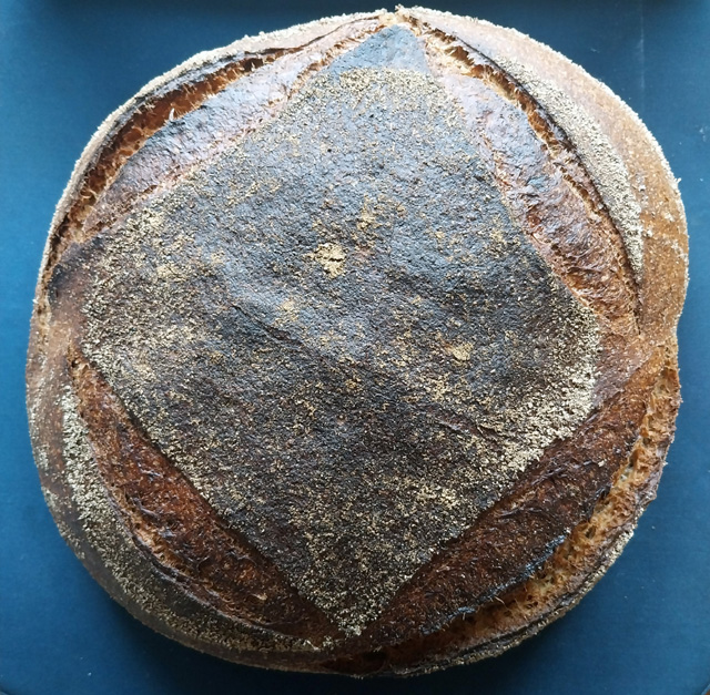 So I set out to make my Classic Sourdough which is 50% bread flour, 50% wholemeal. For this I needed 576g of each. No problem with my reserves of Shipton’s No 4 but my wholemeal stash was a bit sad – probably less than 200g. Added it to the bowl and started to work towards the goal of 576g. A shovel full of bran followed by the remains of my home-milled flour + a heap of spelt. The only thing to hand that didn’t go in was rye. Anyway we made the total, adjusted the hydration and away we went.