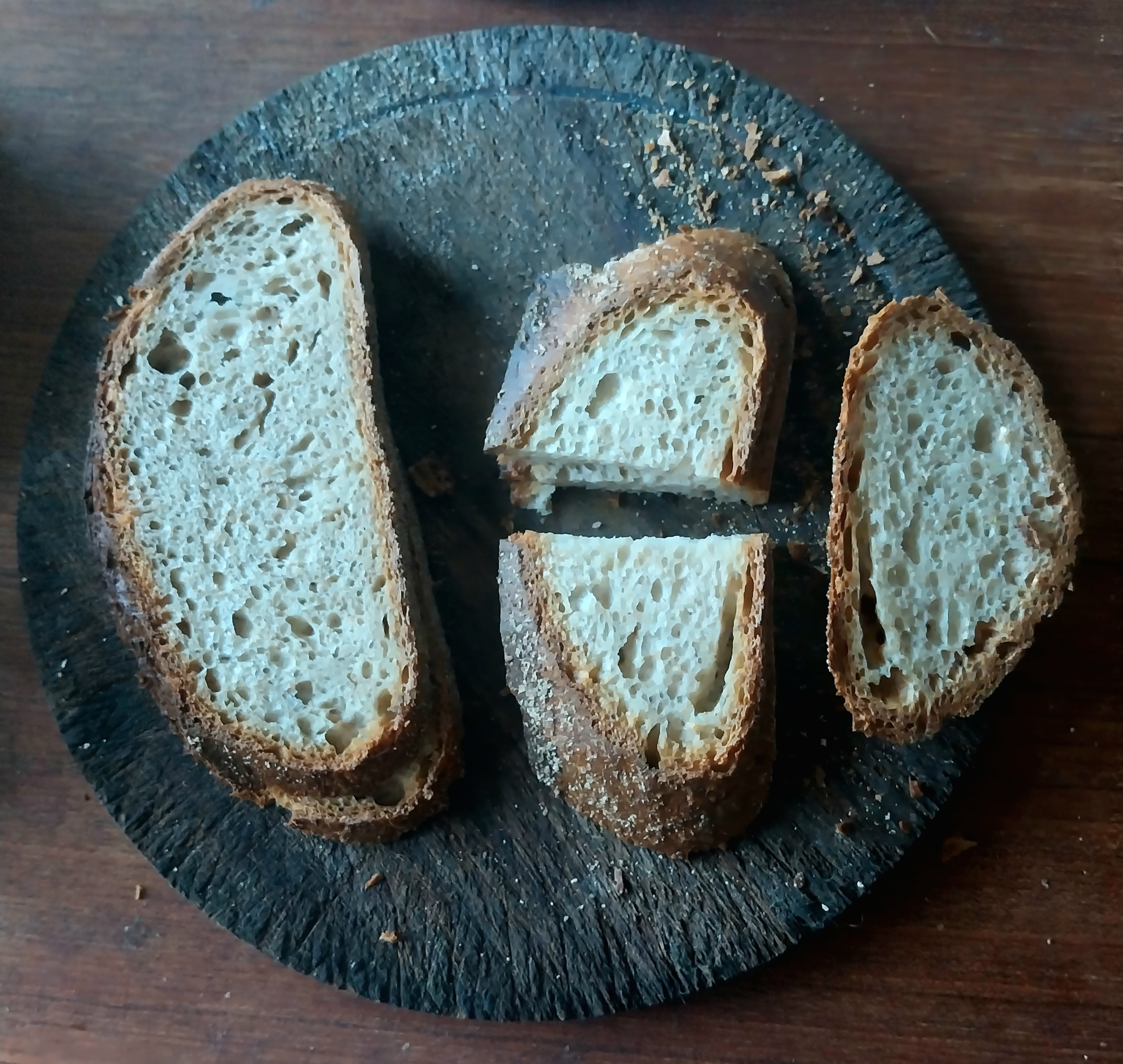Usual method (hand mix, 10 kneads x 3 at 5 minute intervals, 4 hours bulk, 3½ hours proof. Bake 50 minutes at your usual bread baking temperature.)