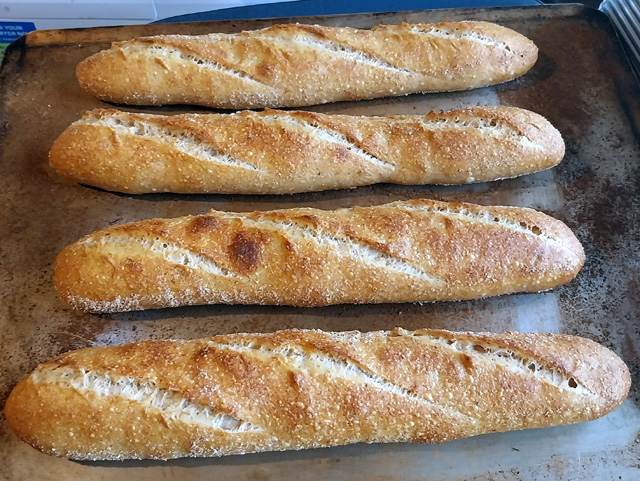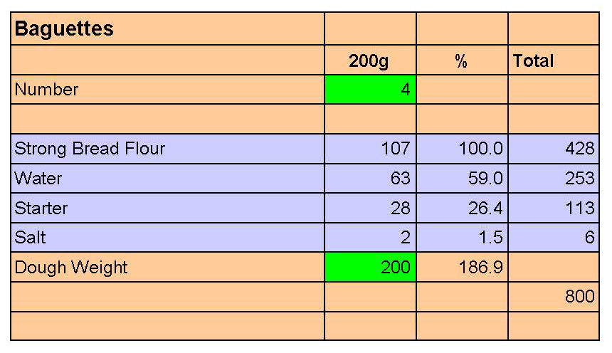 Now that I’m only baking for the two of us, I’ve settled down to turning them out in fours. From our perspective one 200g baguette is breakfast. I hang them up from a hook in an open-topped freezer bag and they get heated up in a hot oven ready for breakfast. The first one goes straight in, and the others, as they get staler, get the old trick of being shoved under the tap before reheating. Very hot oven, 5-6 minutes.