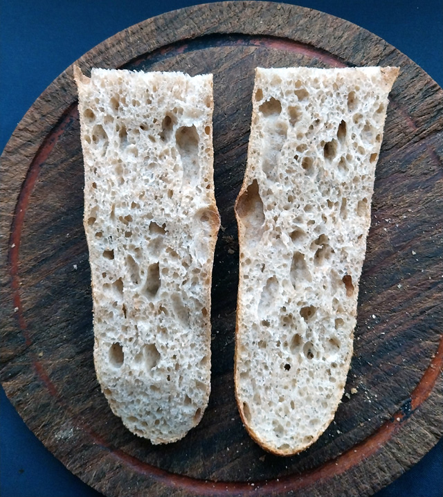 My usual method: hand mixed, 10 kneads repeated 3 times with 5 mins rest between each. 4 hours bulk fermentation, stretch and fold at the end of first 3 hours. Roll out the baguettes, flatten them slightly and place in couches floured with wholemeal rye. I improvise couches using tea towels. Prove about 3 hours – they prove faster than loaves. Flatten again very slightly, slash and bake.