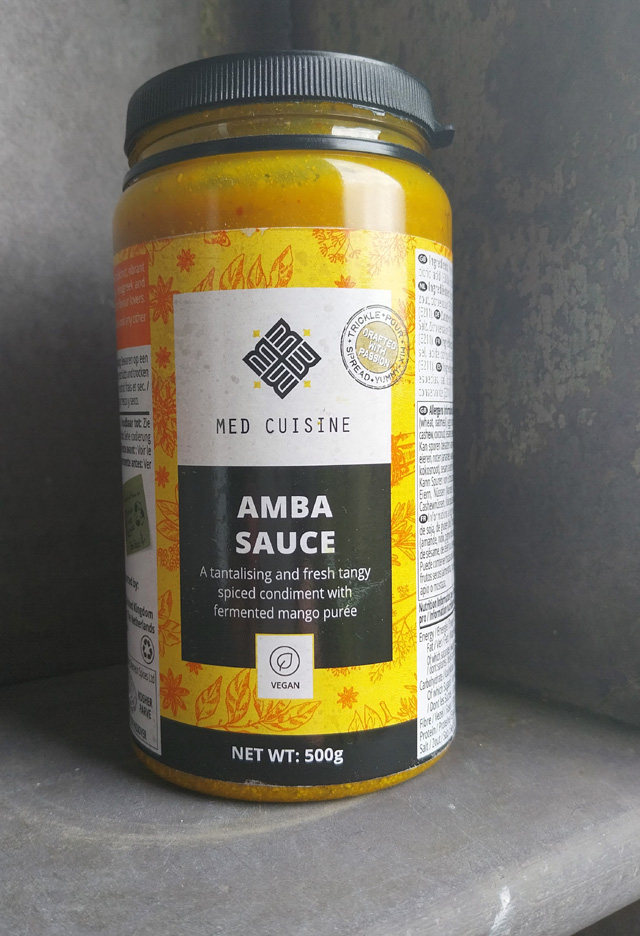 Like Sauce Amba. Easy enough to see it’s a mango sauce I thought I could use mango chutney Indian restaurant style. But a quick bit of internet research says it is a spicey sauce made of fermented mangos originating in Iraqi Jewish tradition.