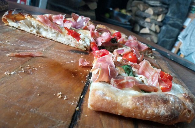 Spread the Buratta over the base, dotted with halved cherry tomatoes. Baked for about 10 minutes (until things were starting to brown). Scattered with basil leaves, added torn pieces of Serrano, drizzled on best olive oil. Back in the oven for two minutes. Dished.