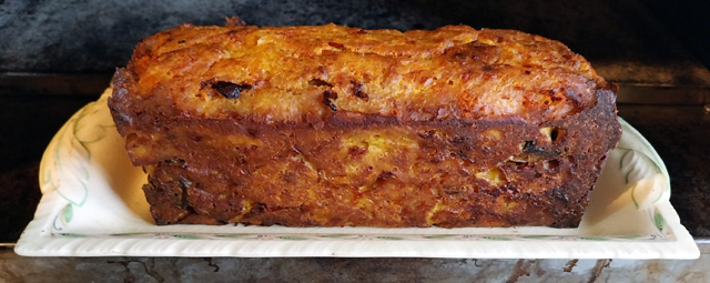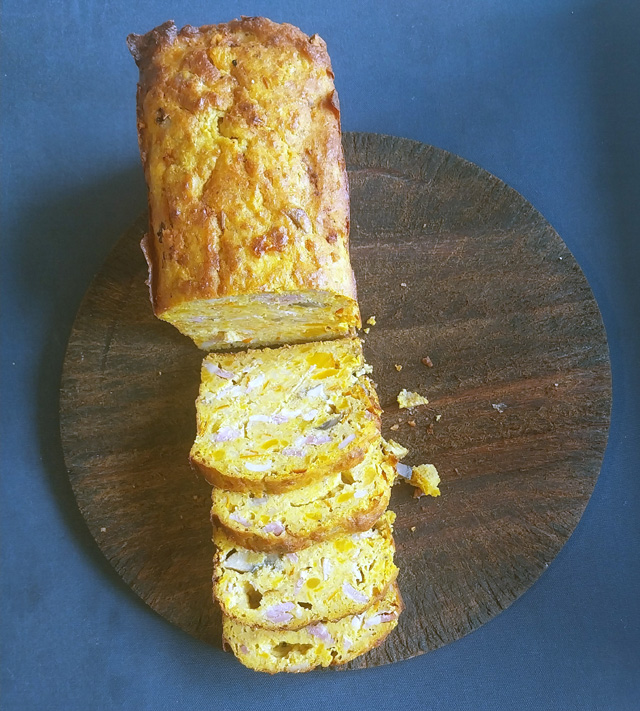 Cake Salé au Potimarron – not really a bread but a savoury cake of spelt, squash, lardons, mushrooms, milk, eggs – sliced to nibble with an aperitif: