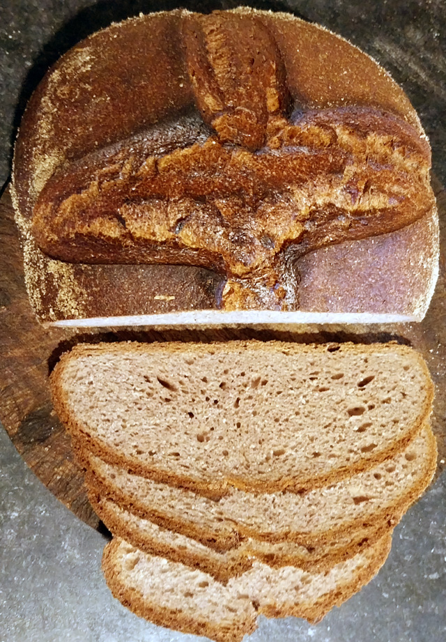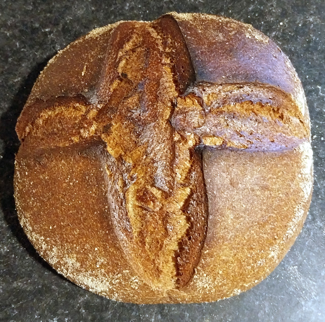 I omitted the walnut halves (and the unnecessary fresh yeast), and used my wheat starter in the absence of a rye levain.