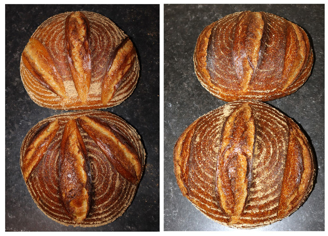 Top left, baby Campagnes; right, Nina’s Bread with Dark Beer & Spelt (about 470g unbaked).