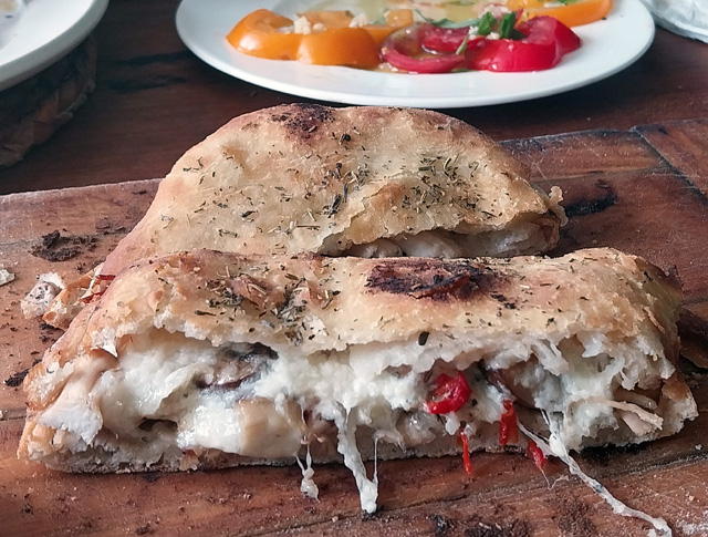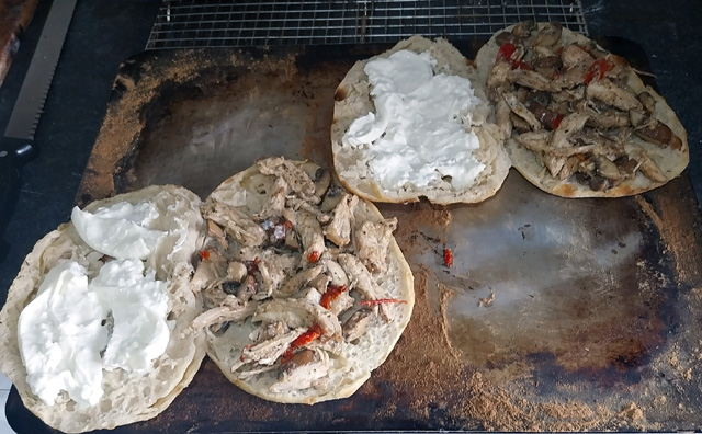 Open out the pizzas like a book. Basically the thinner, top side is covered with cheese and the filling goes on the other side. Not sure if there are any traditional rules to infringe here, so use your imagination (or whatever’s in the fridge). Today the cheese was burrata and the filling was left-over chicken and mushrooms, a little garlic and stock thickened with a sprinkle of flour.