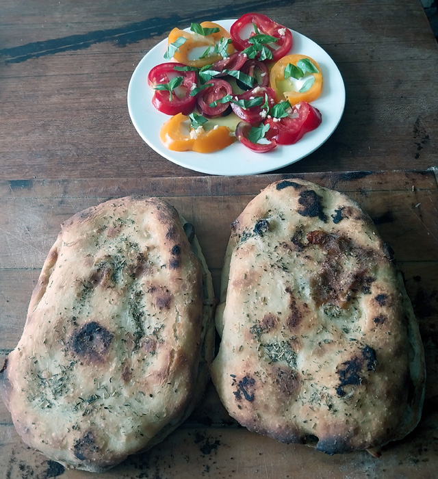 Brush the doughs with olive oil and sprinkle with oregano and salt. Bake in a very hot oven (300C in my Pico) for about 10 minutes. When they are cool enough to handle split them through with a knife leaving one of the long sides attached. If you’ve made then too thin like me, you’re likely to end up with a few holes in the top. Persevere!