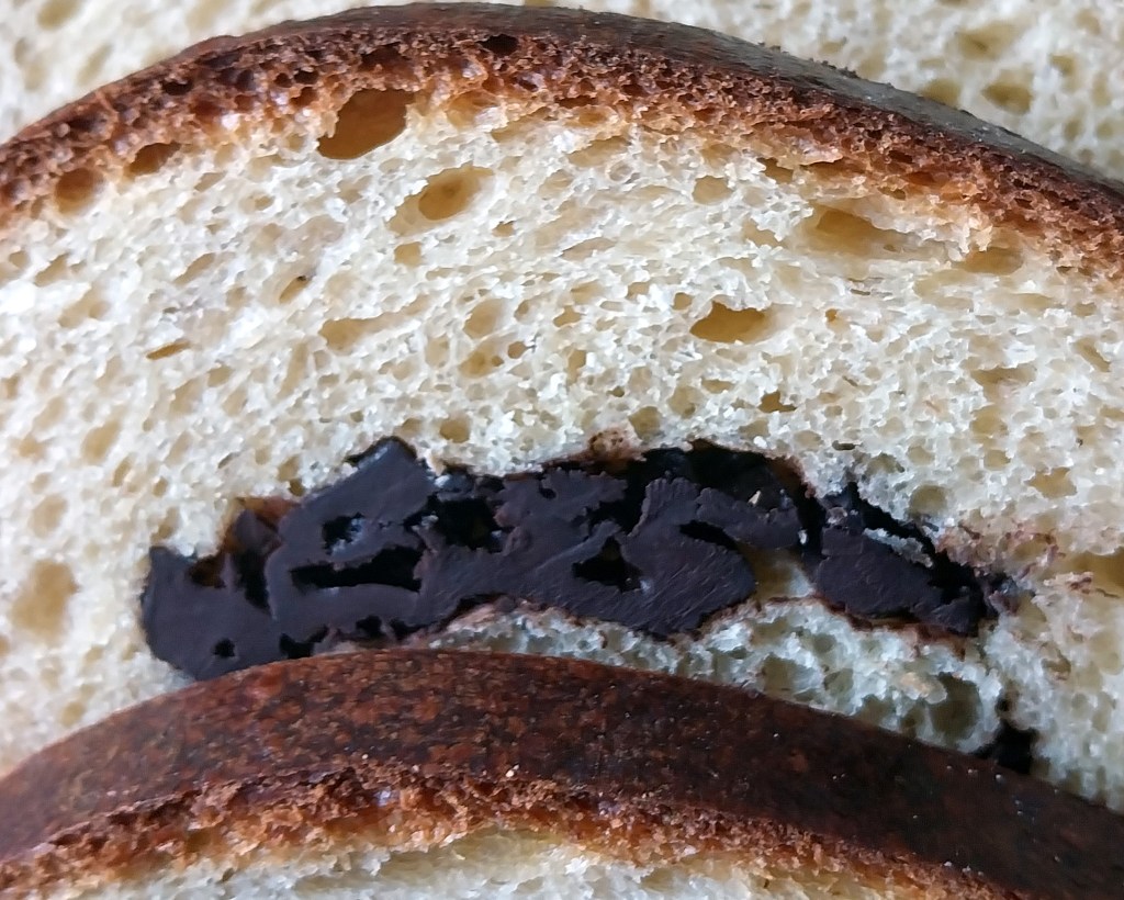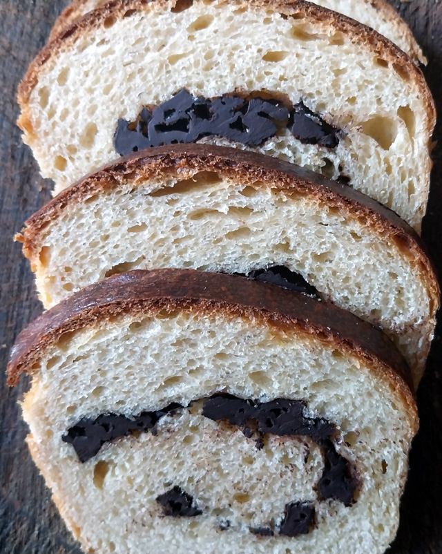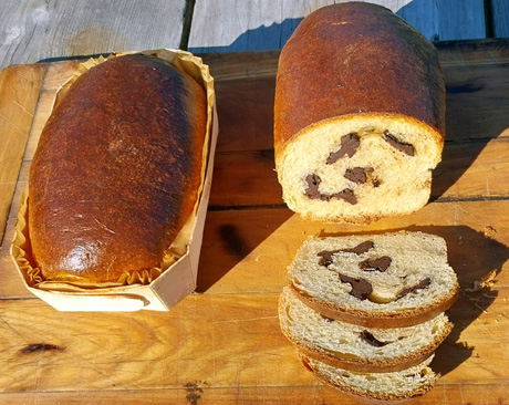 Used to make chocolate brioche for the punters in the old days, but probably haven’t done so in the past decade. Did a short course with Paul Merry (panary.co.uk) about 20 years ago where he demonstrated how to shape breads that were to contain a filling. You press and stretch your dough into what you might call a topless, triangular rectangle. That is a “rectangle” where the top is narrower than the bottom – the bottom (the edge nearest you) to be approximately the length of the tin in which the dough will eventually be baked. The surface of the dough is covered by the filling – in this case, small cubes of chocolate -and then is rolled up, stretching the dough slightly away from you, like croissants, to keep it taut. Because the top gets rolled the most, by the time it reaches the bottom you should have a neat cylinder to drop in your bread tin.
