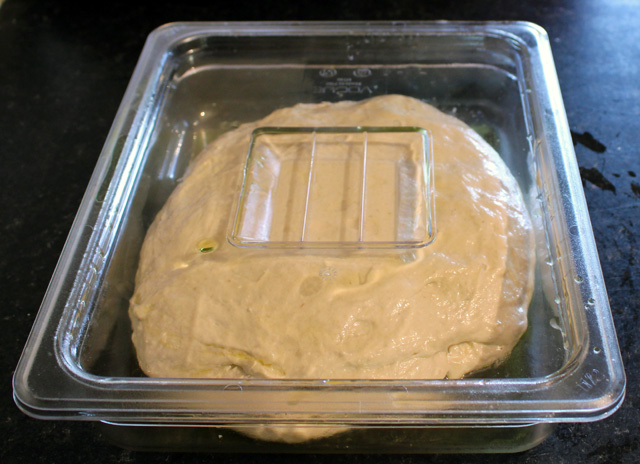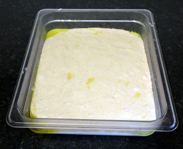 Scrape the dough into a well-oiled container. A shallow rectangular one is useful to help the dough retain its shape when it is eventually tipped out. Give the dough a couple of folds to tidy it up.