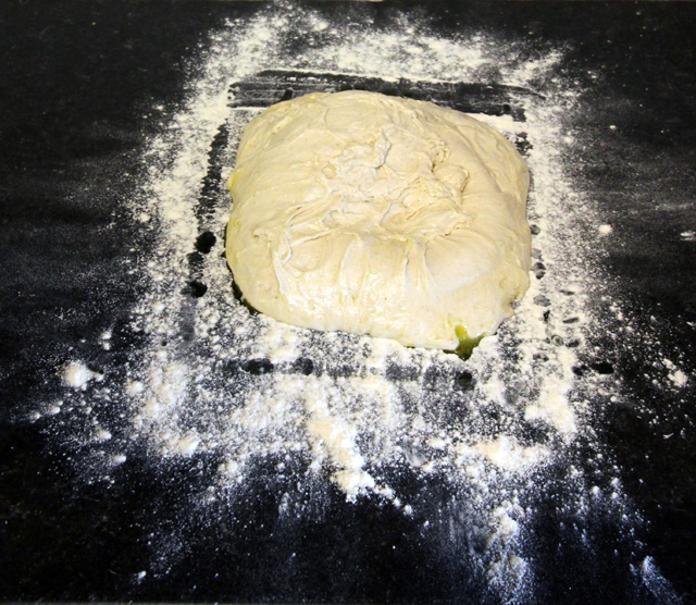 With floured hands fold in the edges, turn the whole thing over (keeping to a floured area), and press out slightly into a neat rectangle of even thickness.