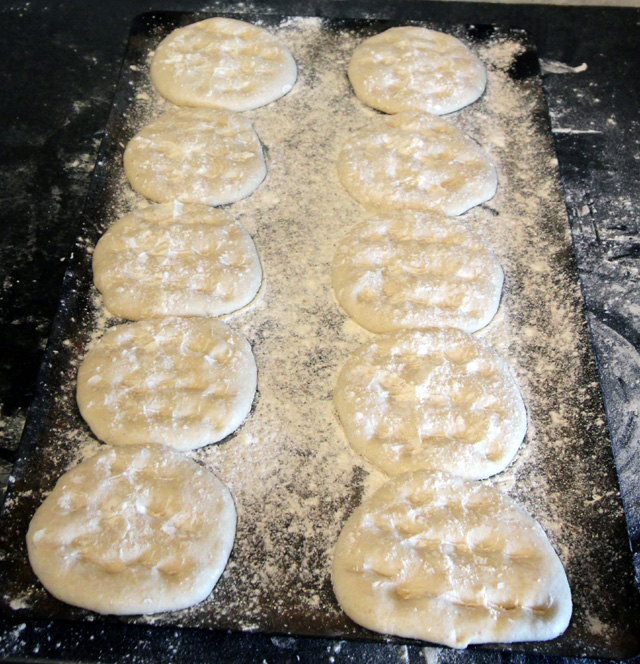 When the oven is up to speed (250C), dimple the dough pieces before putting the tray in the oven.