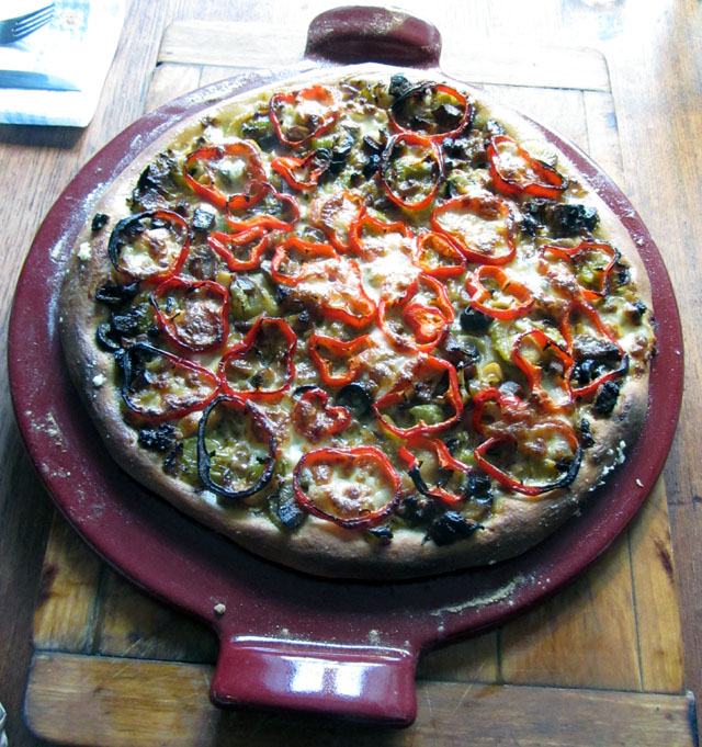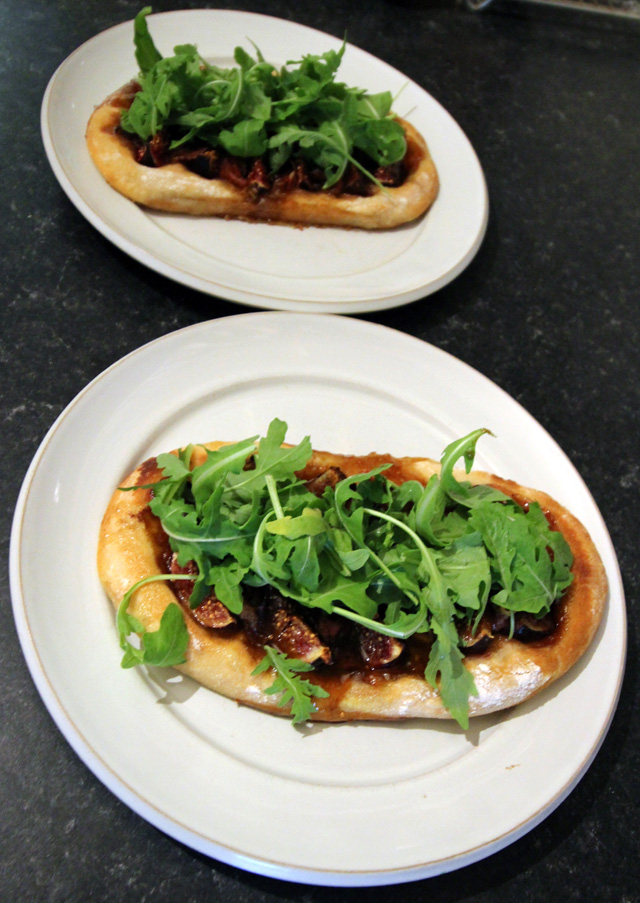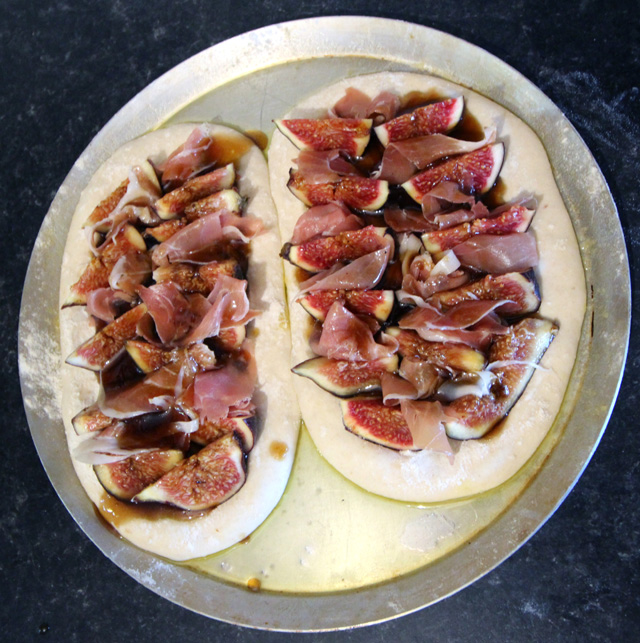 The topping comes from a recipe in the Guardian by Ruby Tandoh – fresh figs and serrano with a coating of honey, balsamic vinegar and olive oil (ratio 2:1:2).