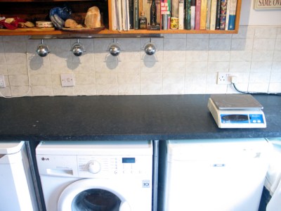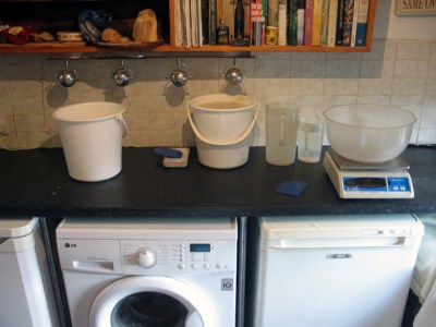 So, 4.00 p.m. A domestic kitchen (and baker) that have seen better days. Note the hi-tech equipment. Be a bit poncey to describe it as my mise en place.