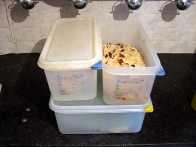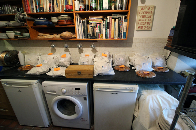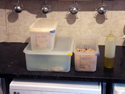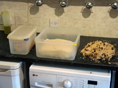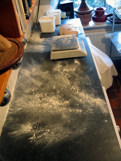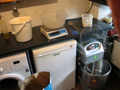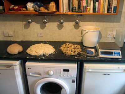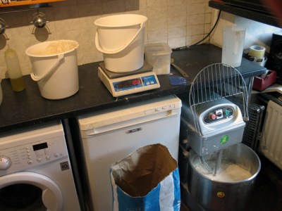 I thought I’d have a go at photo recording a whole bake session – publishing mainly uncropped photos to try to show the reality of (very) small scale baking for sale in a domestic situation with basic equipment. Even though I’m now only an occasional baker and not baking a lot of loaves it’s still quite complex even if I know my routines after more than ten years.
