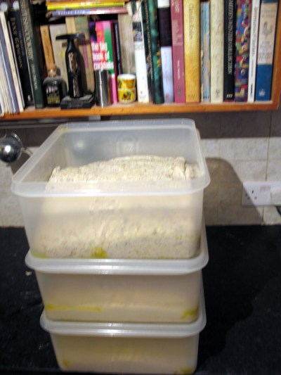 As each dough has been kneaded 3×10 times it goes in an appropriately sized, oiled dough box.
