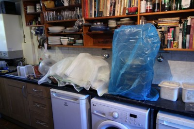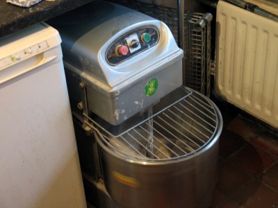 You can just see my little cooling tower tucked away by the side of the mixer. The kitchen is so small that the tower can’t be put up until the mixing is over.