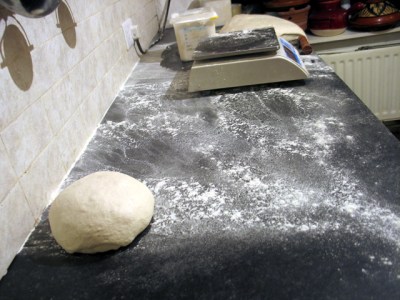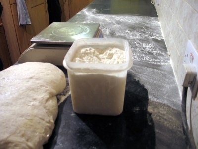 Thursday morning 6.00 a.m. Clean down the work surface yet again. First dough out of the fridge, Campagne.