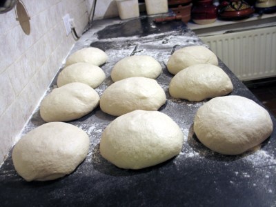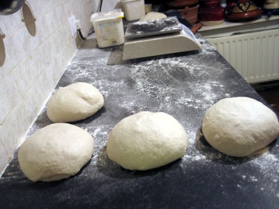 These are scaled at 570g, gently rounded and then pressed out part way on pizza tins which are stacked in my incredibly useful pizza stand.