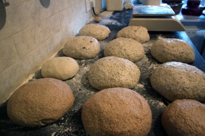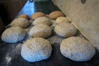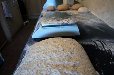 These all get shaped, put in baskets and stacked at the left hand end of the work surface. Along the way we have added a small 5 Seed, spare dough resulting from extra water in the mix the previous evening.