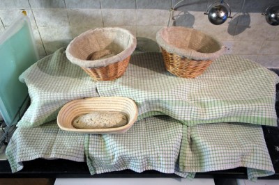 The first load gets properly shaped, put in baskets for 3.5 hours prove. These are stacked on the little, now reassembled, cooling tower and covered to keep them snug.