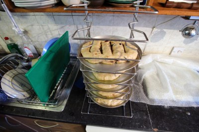 So by now the kitchen is quite crowded. Below, the cooling tower (straight ahead) is empty which means the first load of Campagnes are in the ovens (domestic oven foreground right, Turbofan straight ahead on the high shelf), second load nearest left, Fougasses in the blue-covered tower, third load still on the living room table.