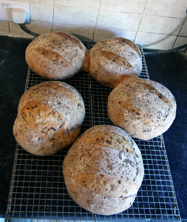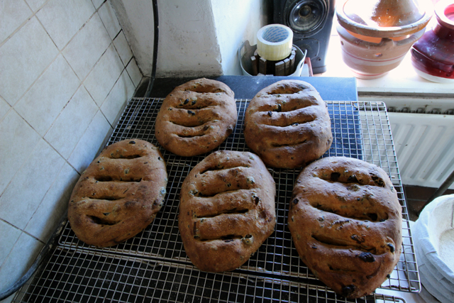 This session I baked 43 items: 10 large + 1 small Pain de Campagne; 2 large + 1 small Wholemeal Wheat; 7 large Five Seed with Spelt; 5 large Onion & Mustard; 5 Fougasse Provençale (500g); 12 Baguettes (200g). Large means 800g (940g dough weight); small means 400g (480g dough weight).