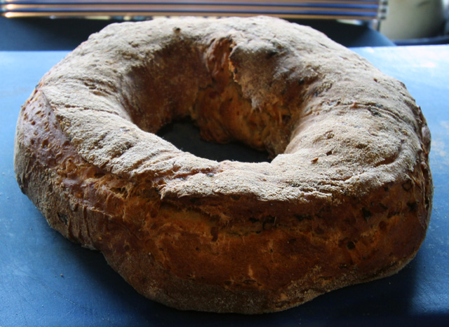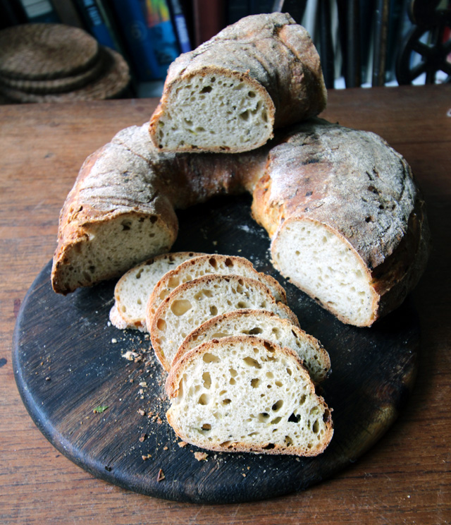 Gently turn out the dough onto a baking sheet floured with wholemeal rye. Slash and bake for about 50 minutes.