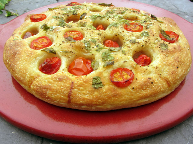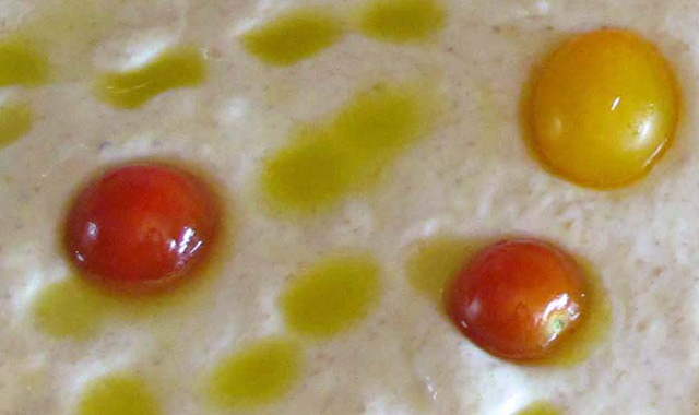 If the tomatoes are large cut them in half lengthways. Press them into the dough cut side up – keep small tomatoes whole. Cover again and leave for a further hour.