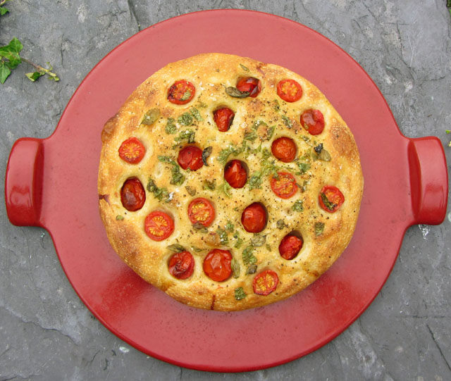 Preheat the oven to 250C. Oil your hands and press the tomatoes into the dough with the flat of your hands. Dip your fingers in the emulsion and dimple the dough all over. This should stop the centre of the dough ballooning when it hits the heat. Pour a couple of tablespoons of the emulsion over the dough. The theory is that in the heat of the oven the water will evaporate protecting the dough from burning in the first stage of baking whilst the oil goes on to give the dough that golden finish in the second half of the bake. Sprinkle the dough with a good scattering of basil or other fresh herbs. Bake for 20-25 minutes reducing the temperature to 200C after 10 minutes.