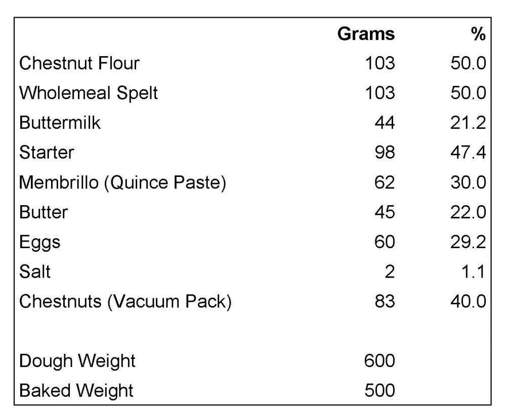 This could be the most expensive bread I ever made. I can get good organic bread flour for £0.96 per Kilo. This uses chestnut flour and spelt – £12.00 & £2.75 a Kilo; vacuum packed chestnuts – £12.00 a Kilo; quince paste – £20.50 a Kilo; buttermilk – £1.20 500ml. Plus the usual butter and eggs.
