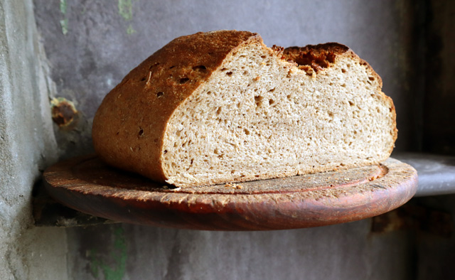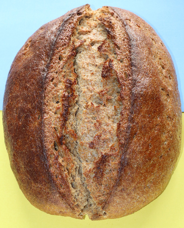 Prove on a floured baking sheet for 2-2.5 hours until cracks start to appear. Single slash down the centre of the dough. Then the recipe says bake at 230C with steam for 7 minutes, reducing the heat to 200C, for a total of 40-45 minutes (internal temperature of 93C. Brush with boiling water and cool on a rack. In my Pico oven I baked at 250C top, 220C bottom with steam for 10 minutes, reduced the top to 220C for a total of 45 minutes.