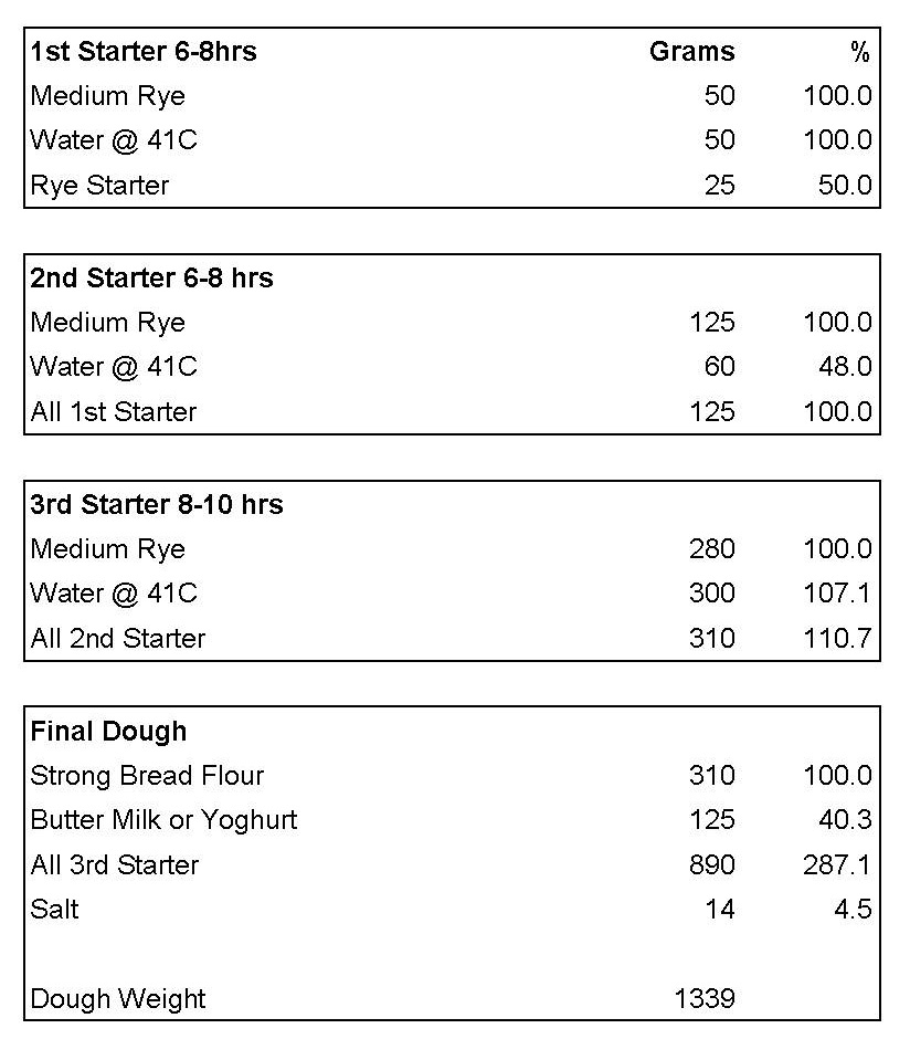 Morning of Day Two, mix the dough. The original calls for Buttermik but I just happened to have some rather fine local ewe’s yoghurt and used that. The recipe also includes 35g Malt Powder but, (1) I didn’t have any, and, (2) I’m not convinced about the need for malt. Didn’t have any medium rye so sieved some dark rye.