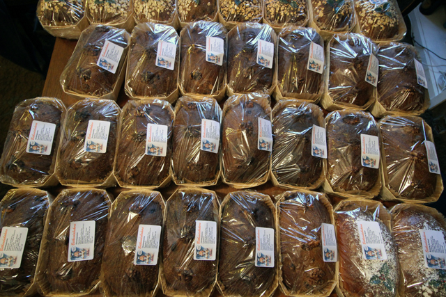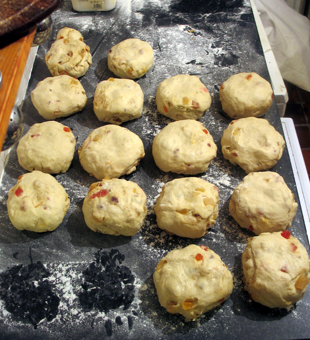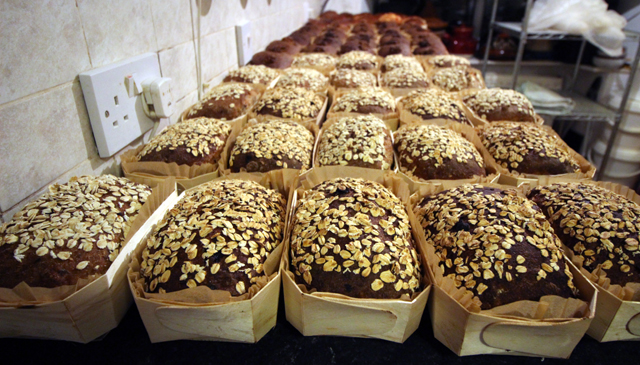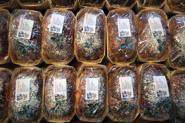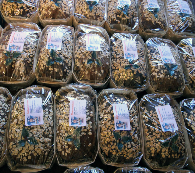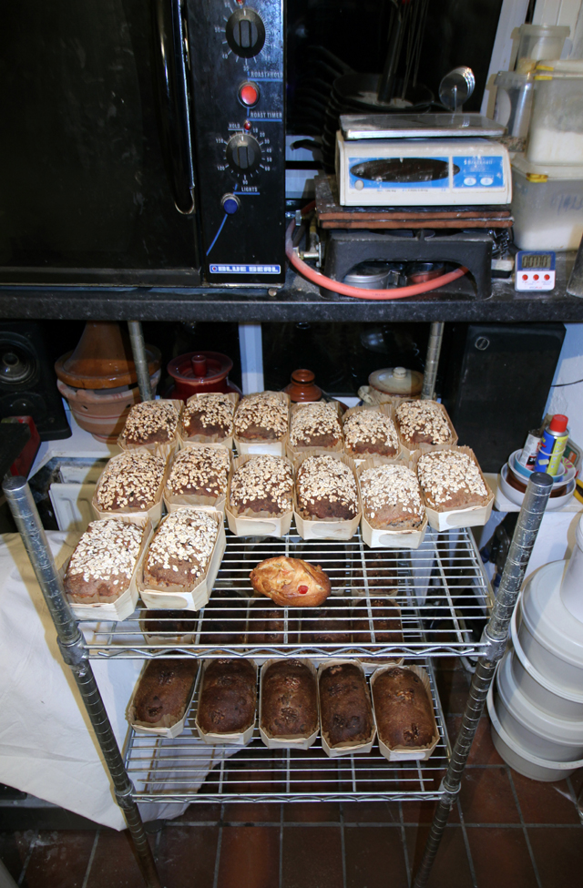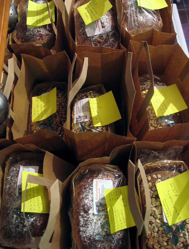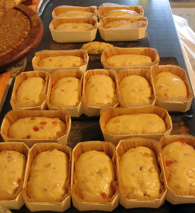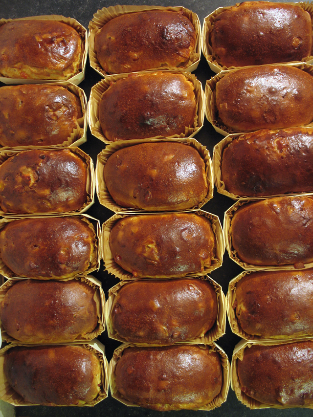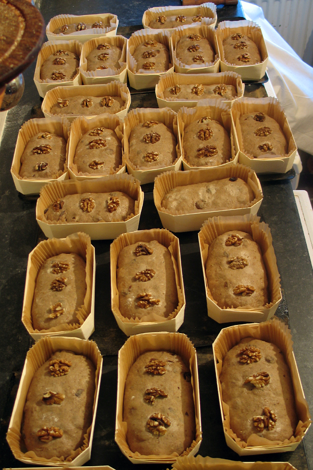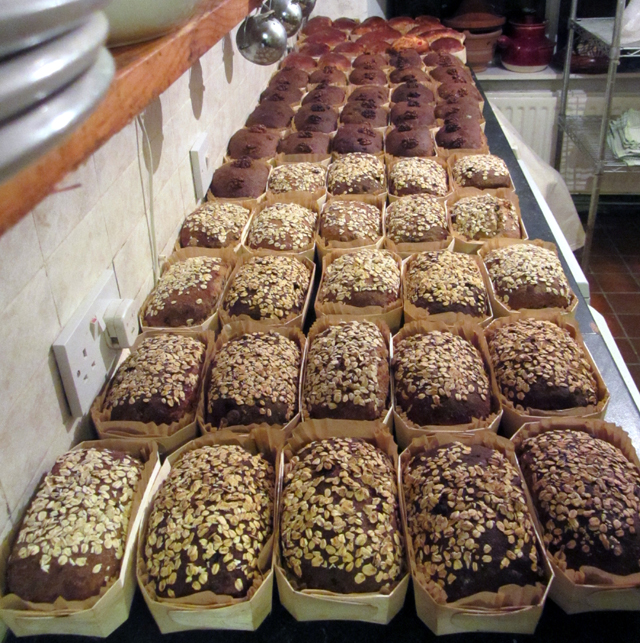 I only bake to order usually giving my customers two days notice. But with a job like this my deadline was two weeks before the bake so I can assemble my ingredients. Flours, grains and seeds are OK – bread flour, wholemeal, rye, oats, sesame all in stock. But everything else needs to be bought in mainly over the net with attendant Christmas delivery worries. Dried and preserved fruits – currants, sultanas, raisins, papaya, pineapple, ginger, glace cherries, whole mixed peel. Walnuts and hazelnuts – you wouldn’t want to over-order them at current prices. Spices – cloves, aniseed, cinnamon. Booze – brandy and mead – not too bothered about over-ordering here – it’ll never go past its use-by date. More general but essential groceries – eggs by the dozen, butter, olive oil, honey, sugar, icing sugar, oranges and orange juice, milk. And don’t forget the cling-film, labels and, most important, traditional plastic holly.