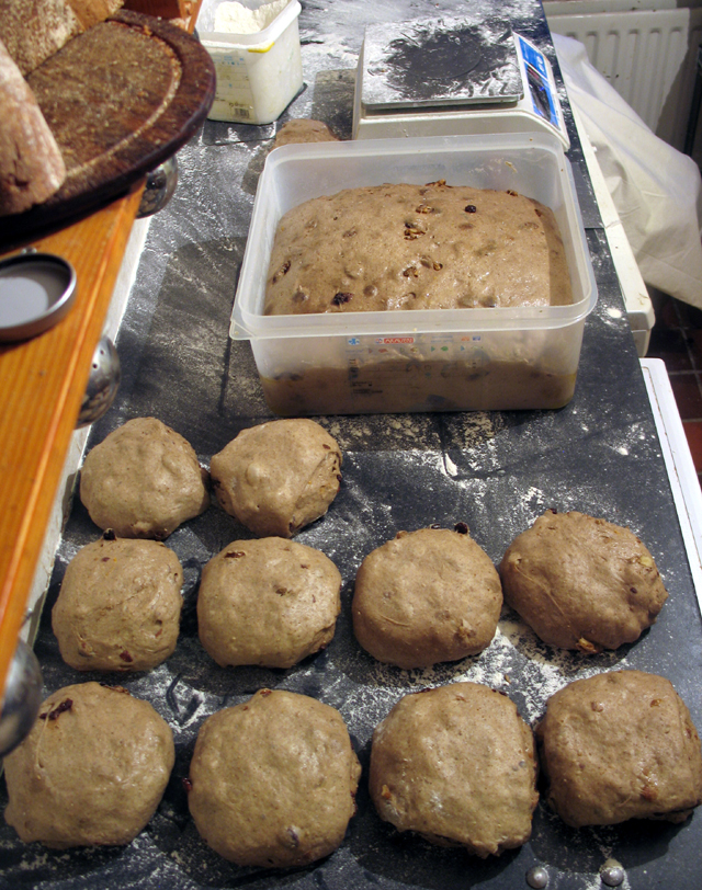 All in all a pretty interesting experience. Because we had the luxury of time we could take orders in advance and not panic when the total rose to 64, get in all the ingredients, check everything 17 times – it almost got stressful having time to worry. Prepping out of the way, the mixing was done on Tuesday evening for overnight bulk fermentation in the fridge. Wednesday morning the strange thing was the different rhythm of the scaling and shaping. Instead of working in my usual batches of 10 x 940g doughs, I was able to get 24 x 600g at a time through the ovens. Very odd.