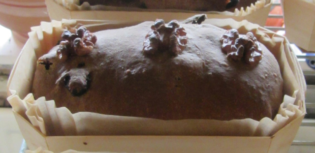 Scale the dough to 600g. Top with a simple pattern of additional walnut halves (wet the bottoms and give them a little wriggle pressing into the dough). Prove and bake in Panibois boxes or similar.