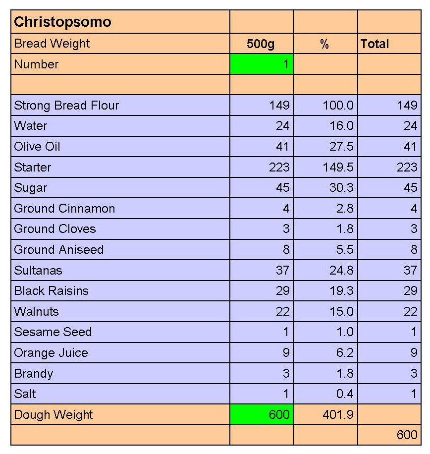 This is the real star of the show and it comes with a story. Klimentini, a Greek customer, brought me a hand-written recipe and asked if I could bake it for her. It was the family recipe that her brother used to bake every year and mail to Wales in time for Christmas. But the previous Christmas the parcel arrived weeks late and the bread was broken into pieces. Maybe the customs thought the heavy spicing was there to mask smells that might otherwise interest the sniffer dogs!