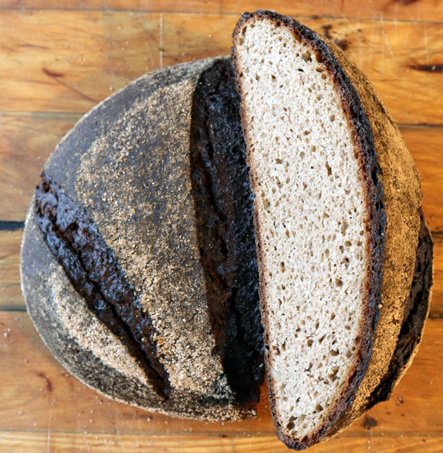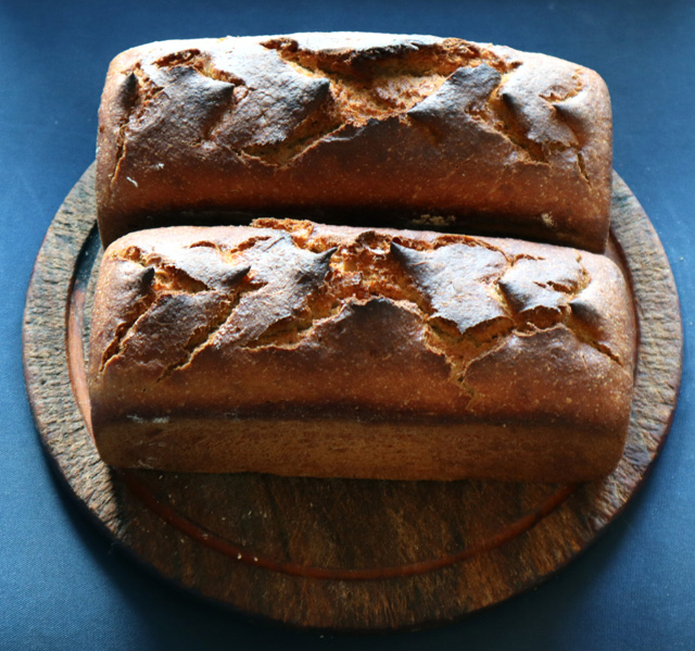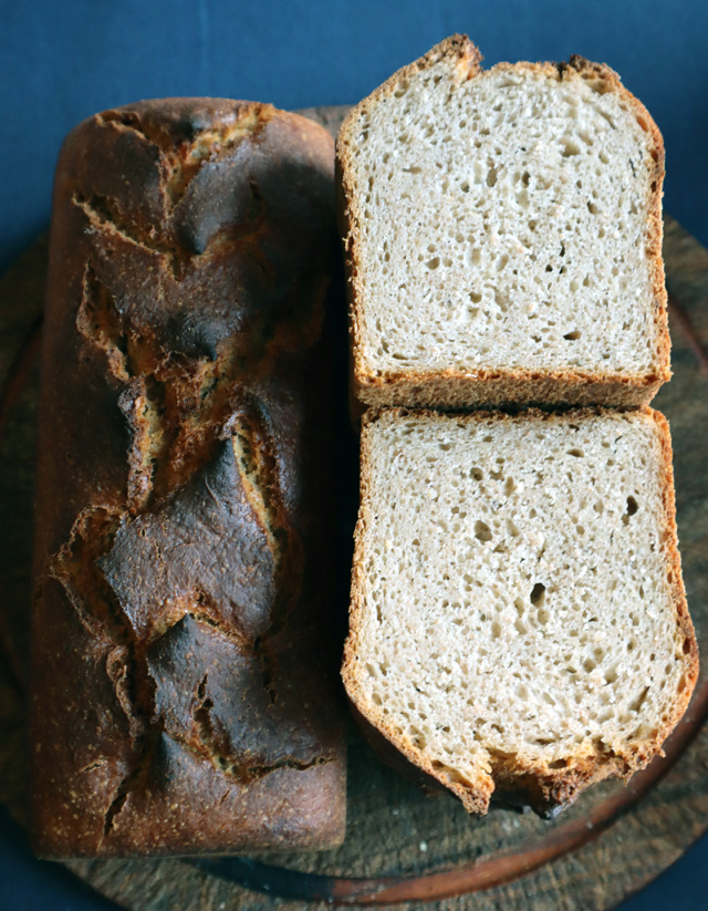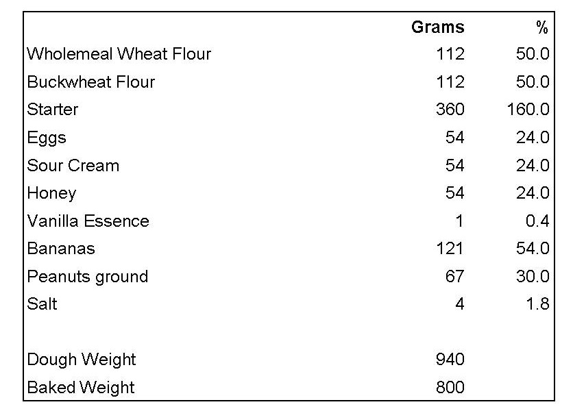 Much better than the first hard-baked loaf: soft crust and crumb, clear flavours of banana and the slightly weird mix of buckwheat and peanut flours. Like it.