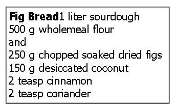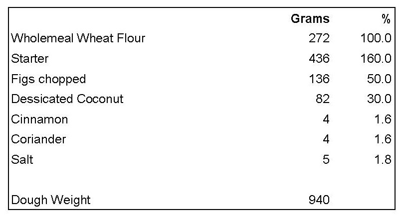 The dough came out extremely stiff. I needed to add 110g water to the formula above. Could be because I used soft figs rather than dried figs soaked, could be a different sort of dessicated coconut. But us bakers need to be able to adapt …